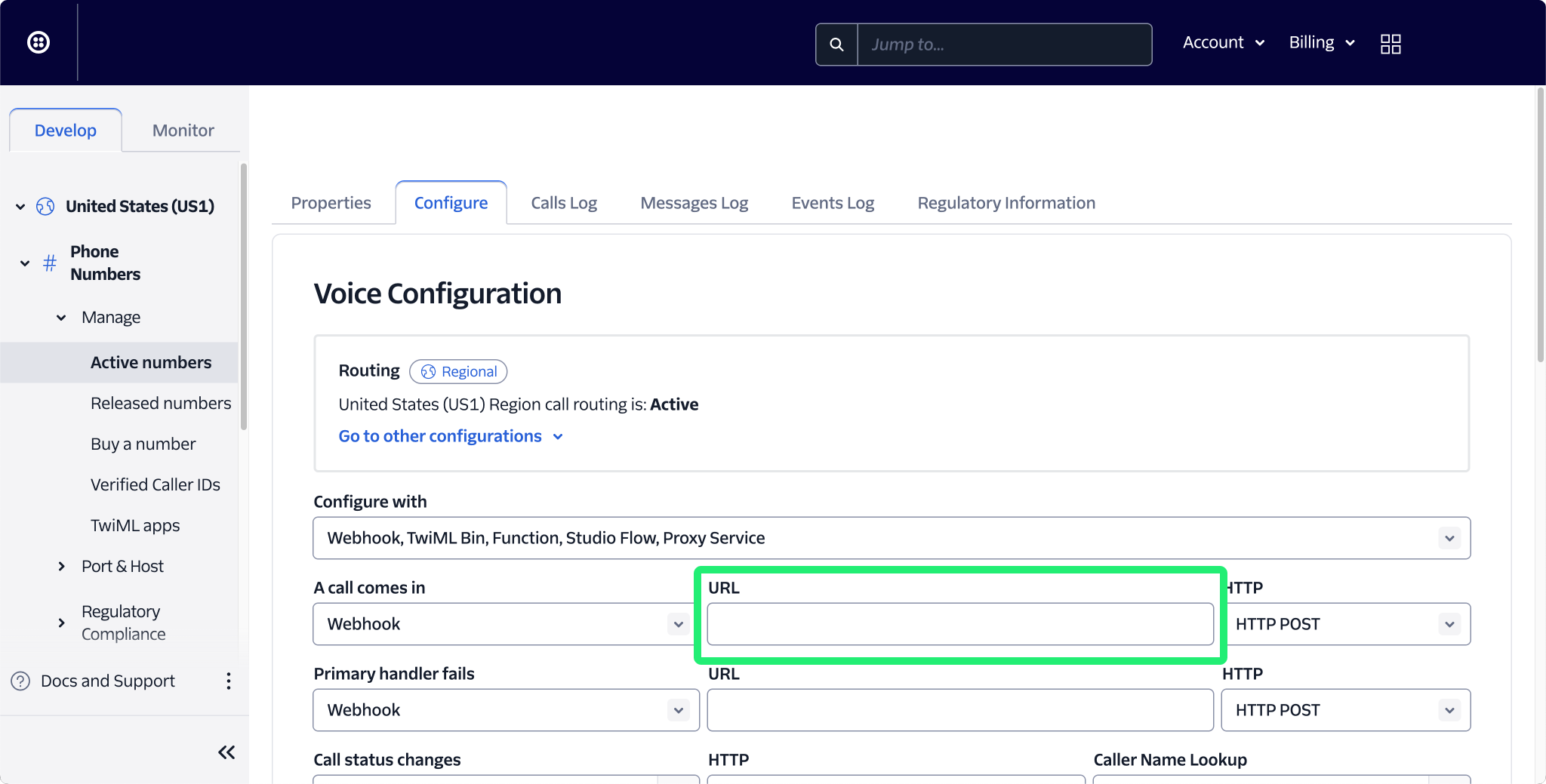Follow Twilio’s guides to create a new number. Once you’ve created your number, navigate to the “Configure” tab in Phone Numbers -> Manage -> Active numbers In the “A call comes in” section, enter the full URL to your application (make sure to add the/call/incoming path):