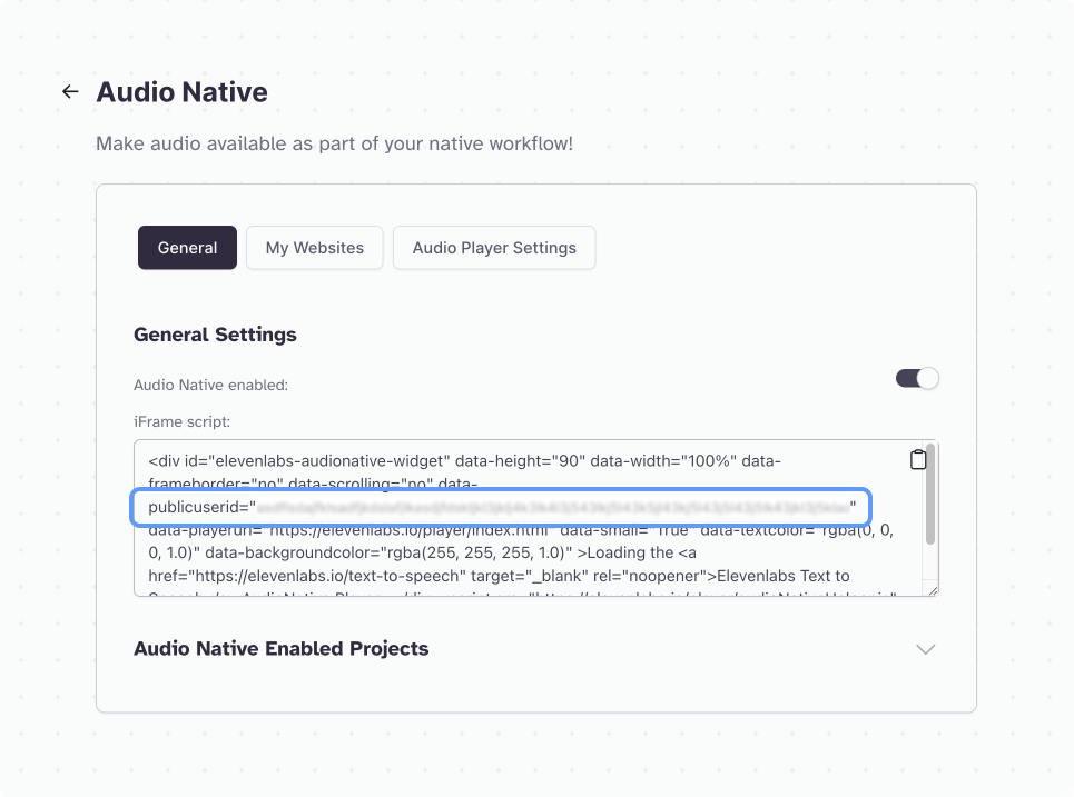 Before you can use this component, you’ll need to retrieve your public user ID from the code snippet. Go back to https://elevenlabs.io/audio-native, and in the code snippet, copy the property calledpublicuserid.
