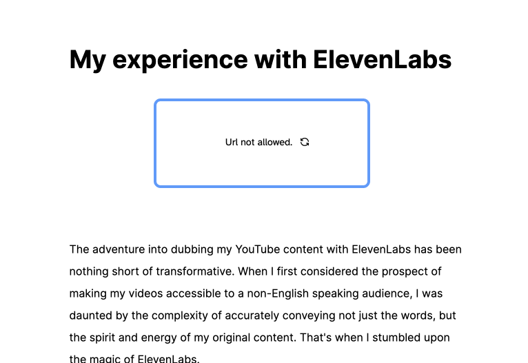 If you don’t see the Audio Native player, try doing a hard refresh. This can sometimes be an issue because of the development server not properly reloading the script. In Chrome it’s: (⌘ or Ctrl) + Shift + RWhy am I seeing “URL not allowed”?