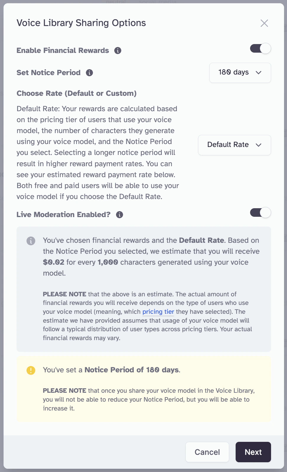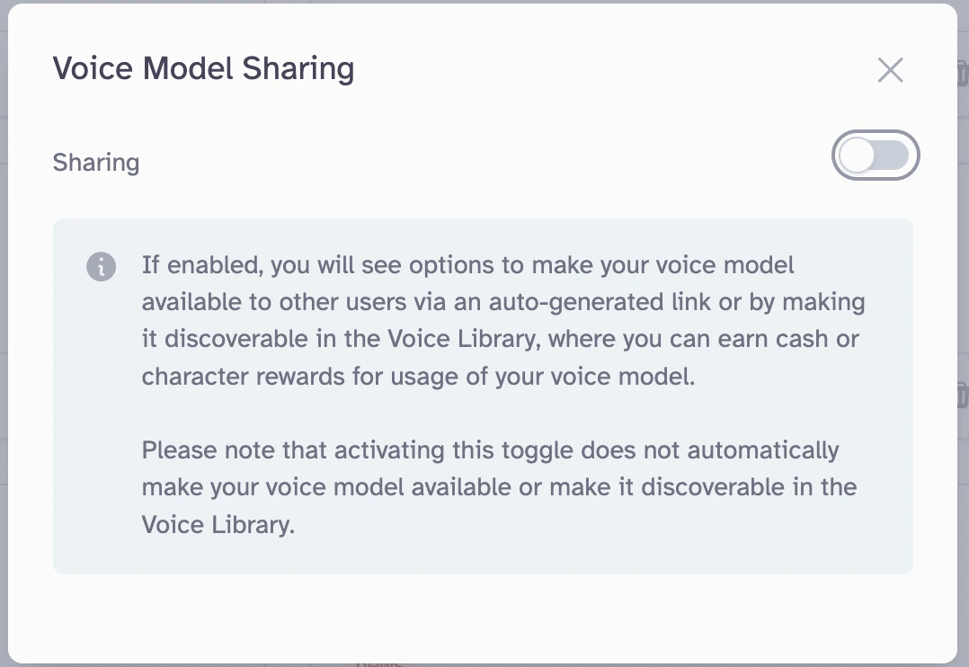 - Discovery in Voice Library: this makes your voice model discoverable in the Voice Library and takes you to the sharing dialog detailed in Step 4 below.
