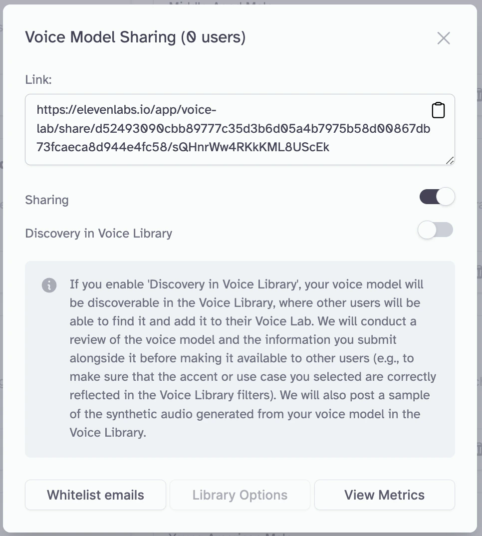 - Sharing Link: share this link with your audience, your friends, or anyone else that you want to be able to make a copy of your voice model in their VoiceLab.