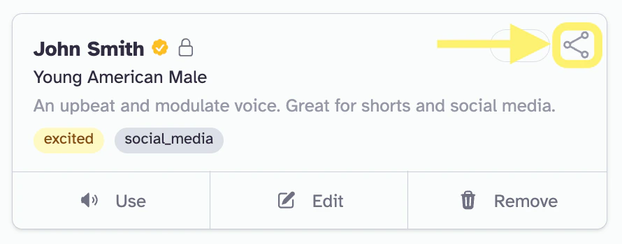 - Please note that these options only appear for Professional Voice Clones – you won’t see them when sharing a synthetic voice created using our Voice Design tool. Synthetic voices have limited sharing options and only earn character rewards.
